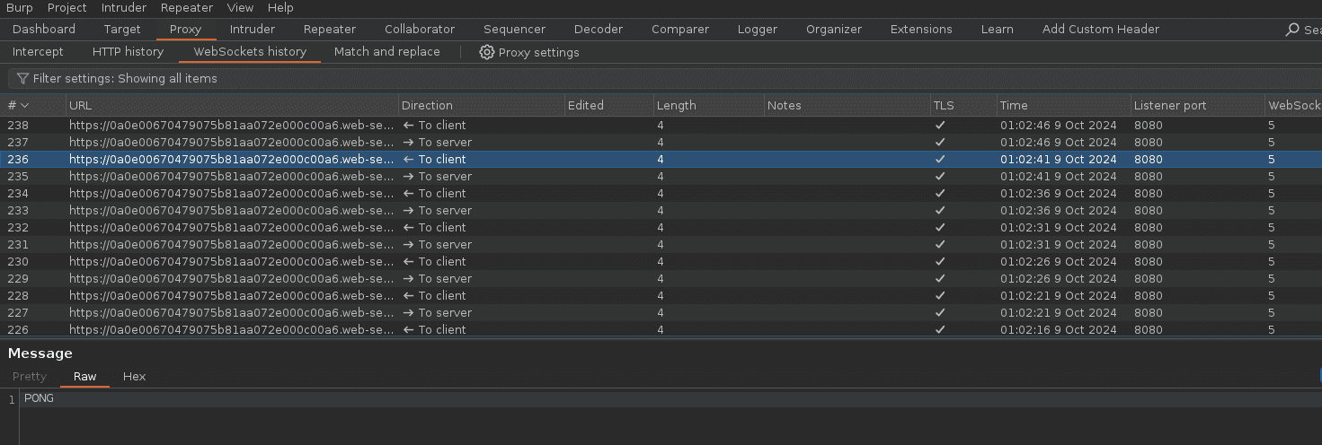 To do this, look for the HTTP Status 101 “Switching Protocol” HTTP Status in the Proxy > HTTP History tabs.