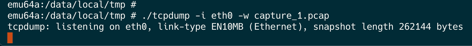 emu64a:/data/local/tmp $ ./tcpdump -i eth0 -w capture_1.pcap